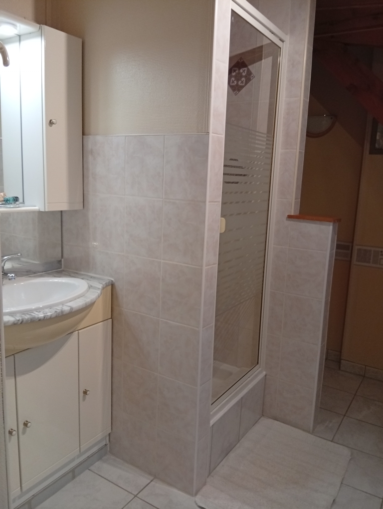 Vous bénéficierez d’une salle de bain privative, lumineuse et bien équipée, avec lavabo, miroir et rangements, pour un confort optimal pendant votre séjour.