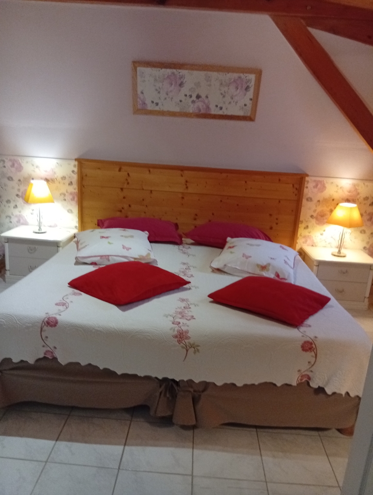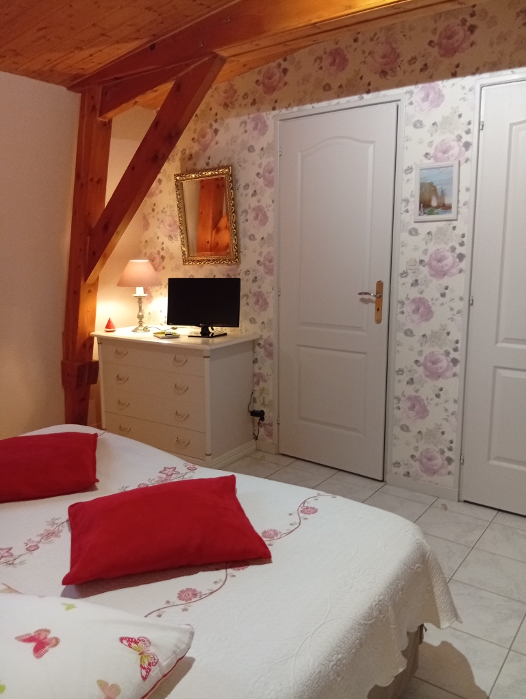 La décoration, délicatement inspirée de l’univers floral, apporte une atmosphère douce et apaisante. Les tons clairs, le linge de lit harmonieux et les poutres apparentes en bois créent un cadre à la fois authentique et confortable. L’espace est pensé pour que chacun puisse profiter d’un séjour agréable, avec des rangements pratiques et un petit coin équipé d’une télévision pour vos moments de détente.